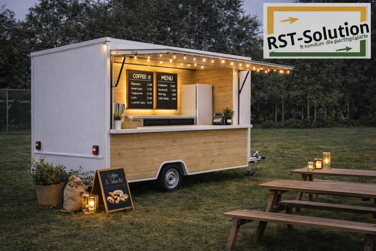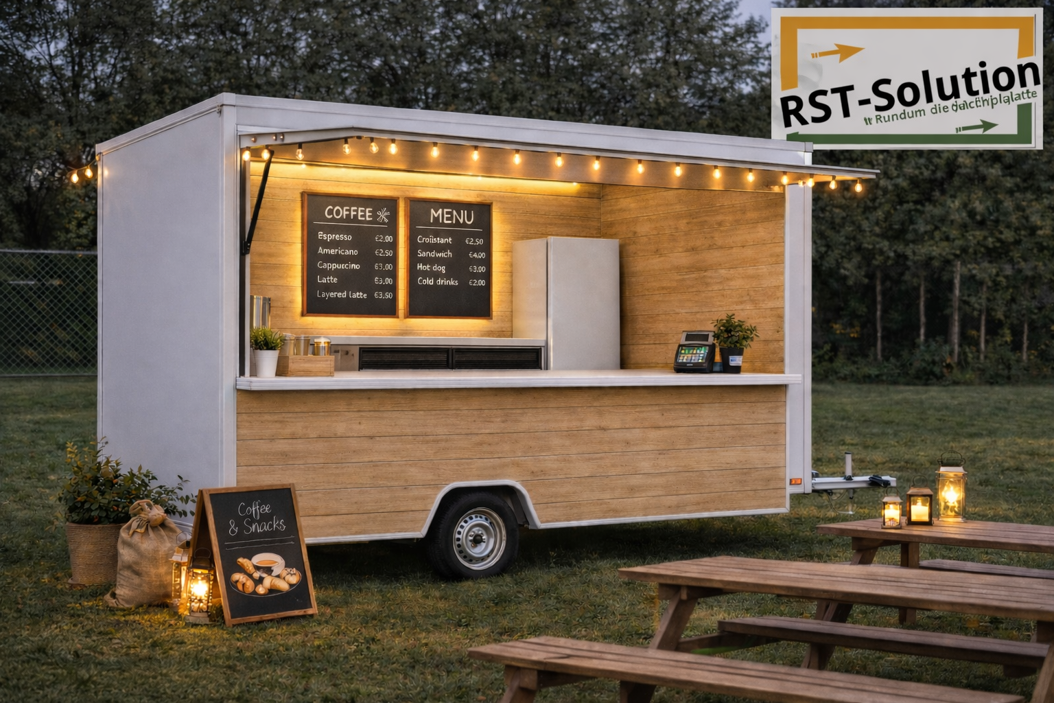 Die große Seitenklappe bildet in geöffnetem Zustand gleichzeitig ein Schutzdach. Im Inneren des Anhängers sorgen zusätzlich indirekte LED-Leuchten entlang der oberen Wandkante für eine freundliche, gemütliche Lichtatmosphäre.