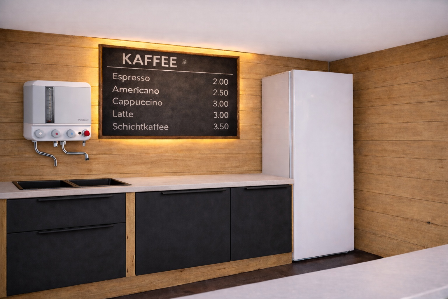 Die Rückwand im Verkaufsbereich ist ebenfalls mit Holz verkleidet. Dort hängt eine schwarze Kreidetafel für die Menü- und Preisliste.