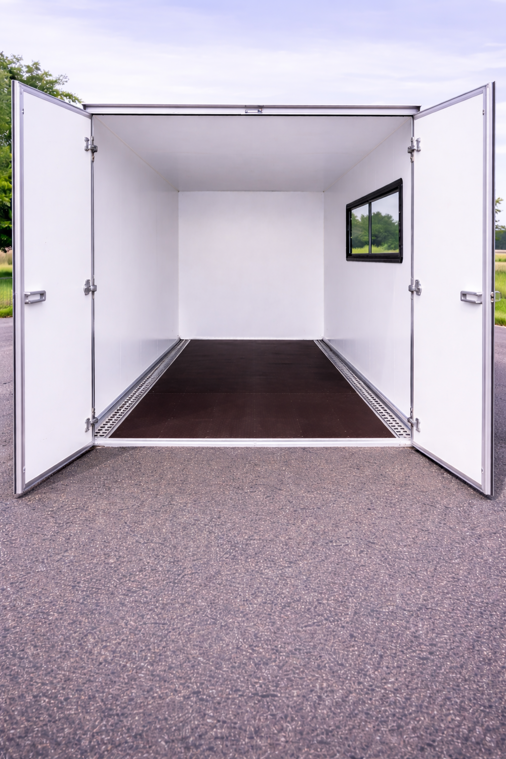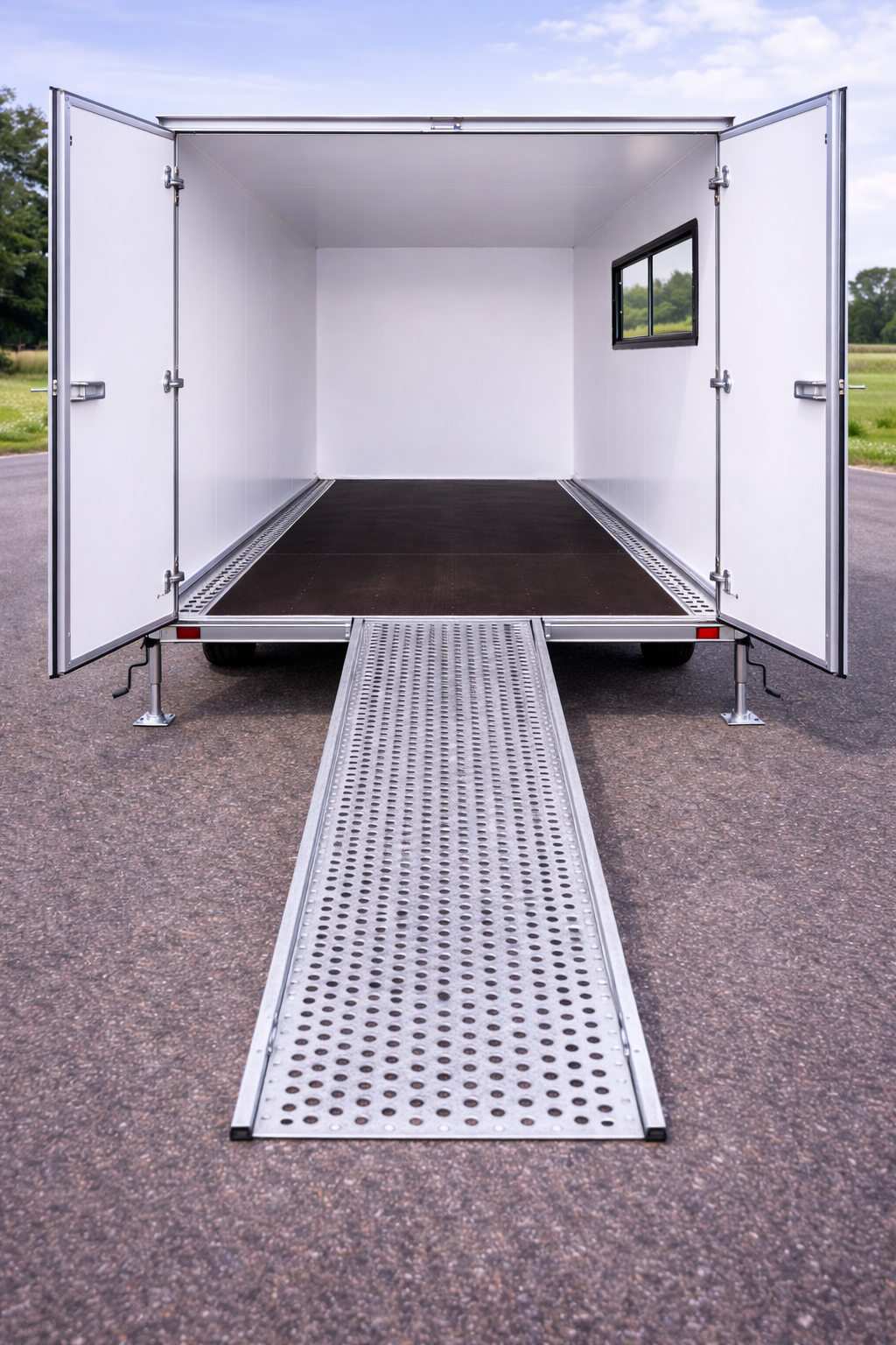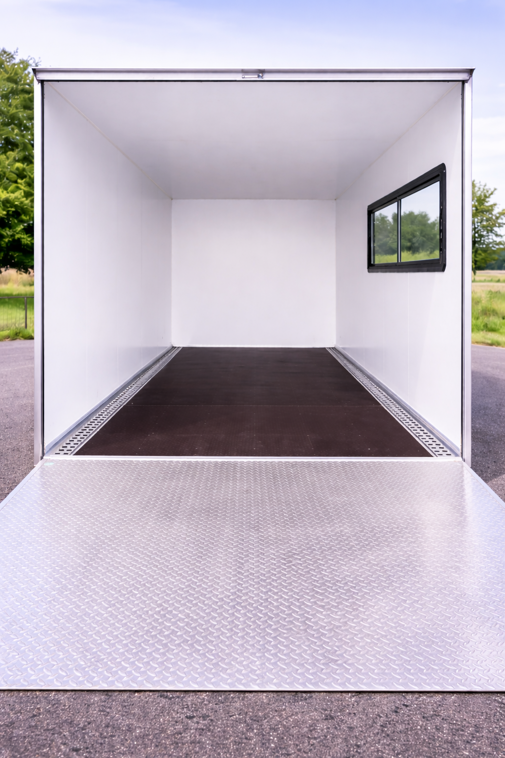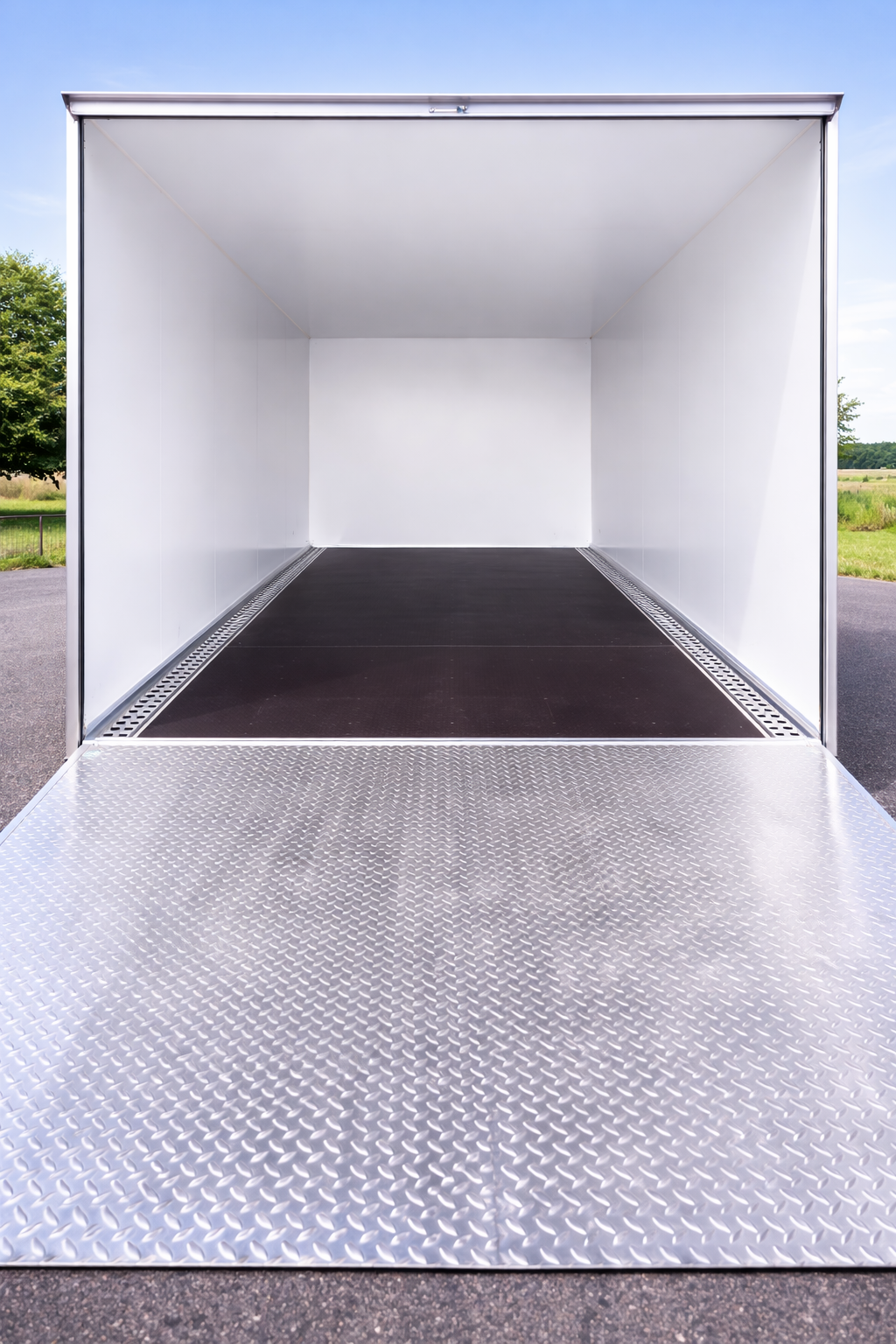 Im hinteren Teil des Anhängers befindet sich ein Laderaum, der mit einer Flügeltür oder Heckklappe ausgestattet sein kann, um verschiedene Fahrzeuge wie Fahrräder, Motorräder, Schneemobil oder Quad sicher zu transportieren.