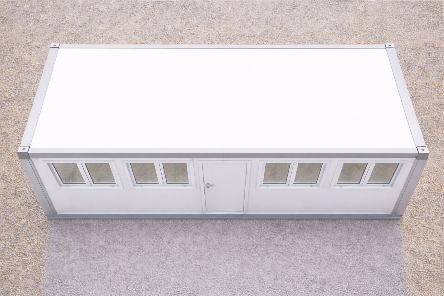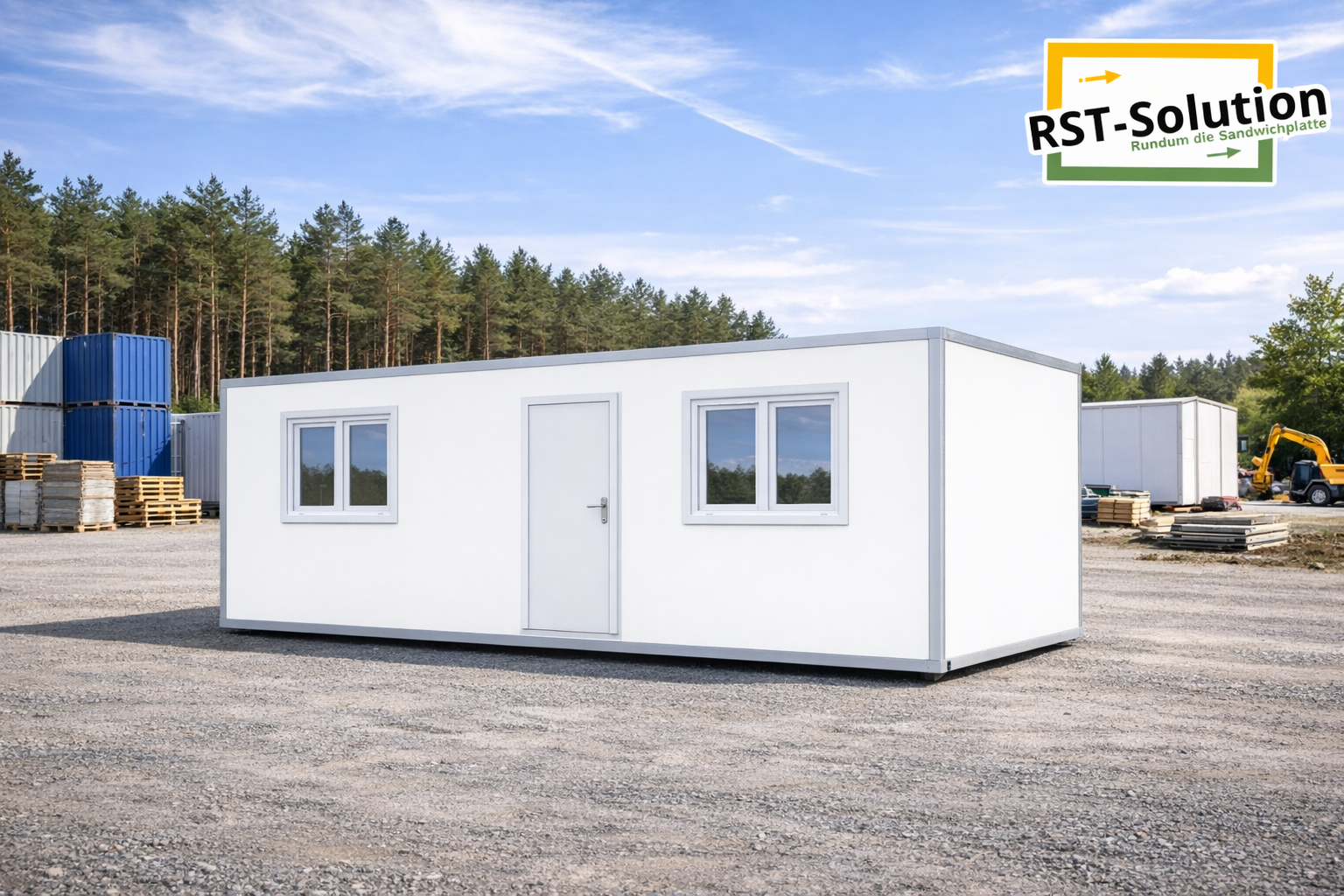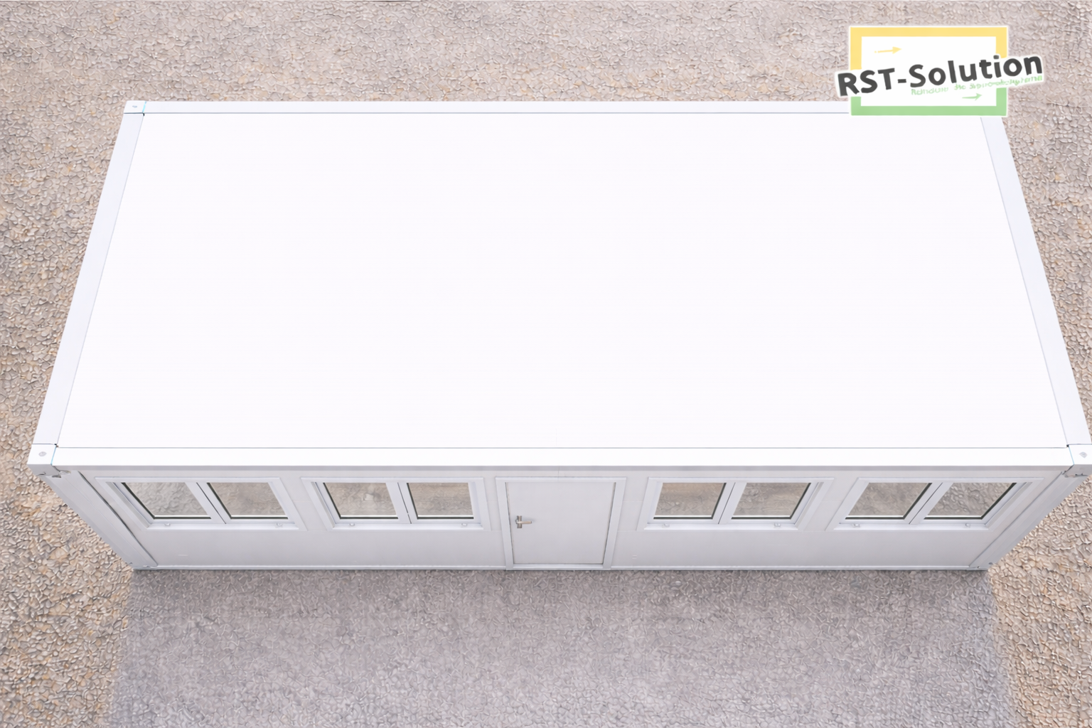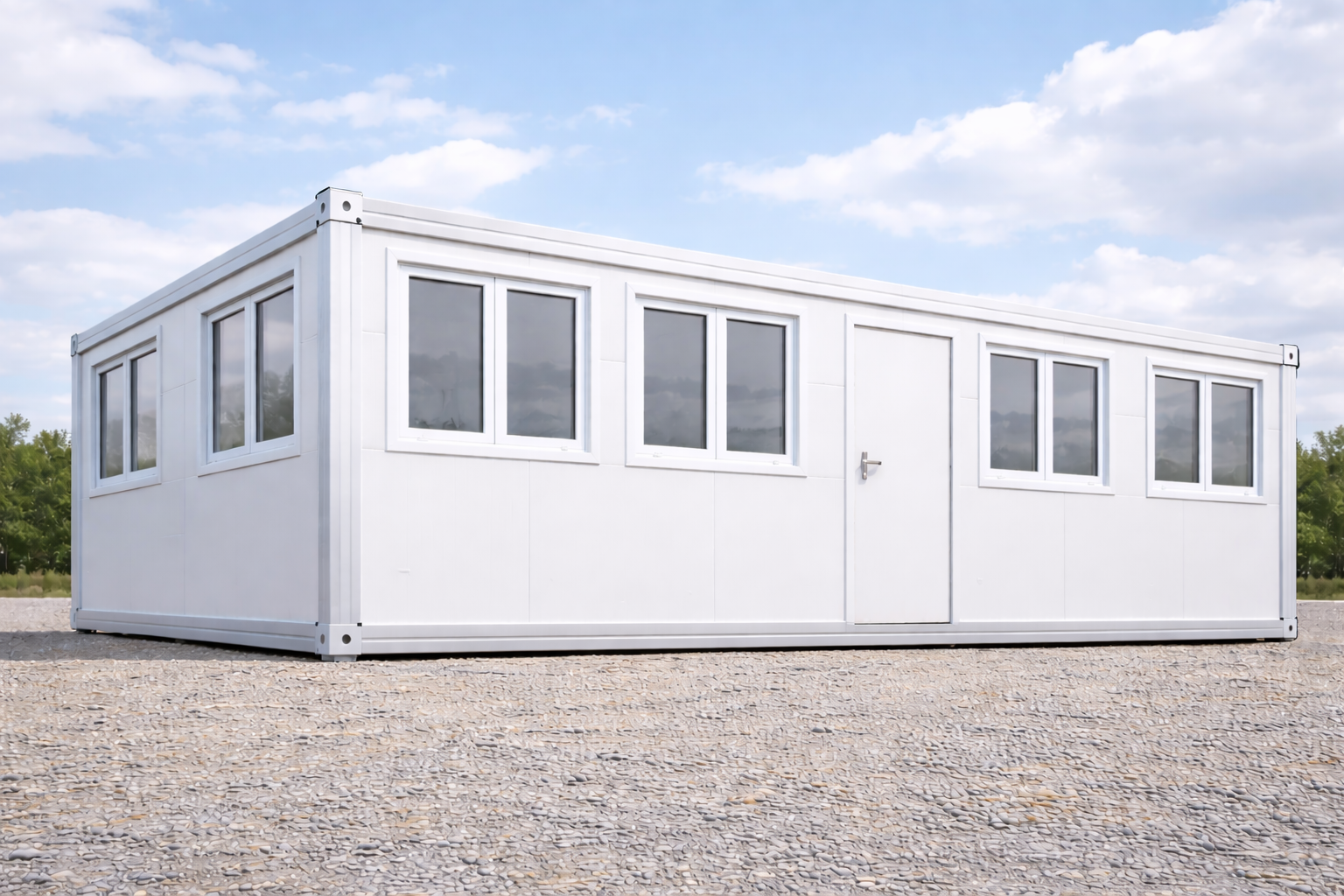 Der Container präsentiert sich in zeitlosem Weiß mit flachem Dach und klarer, funktionaler Linienführung.