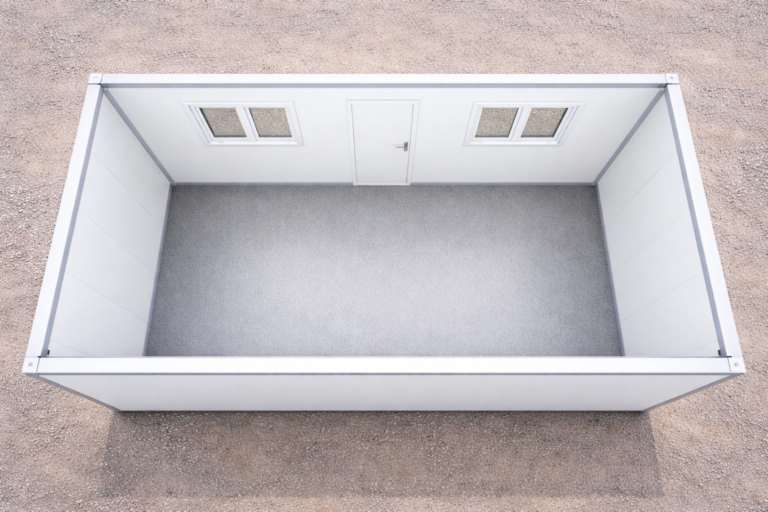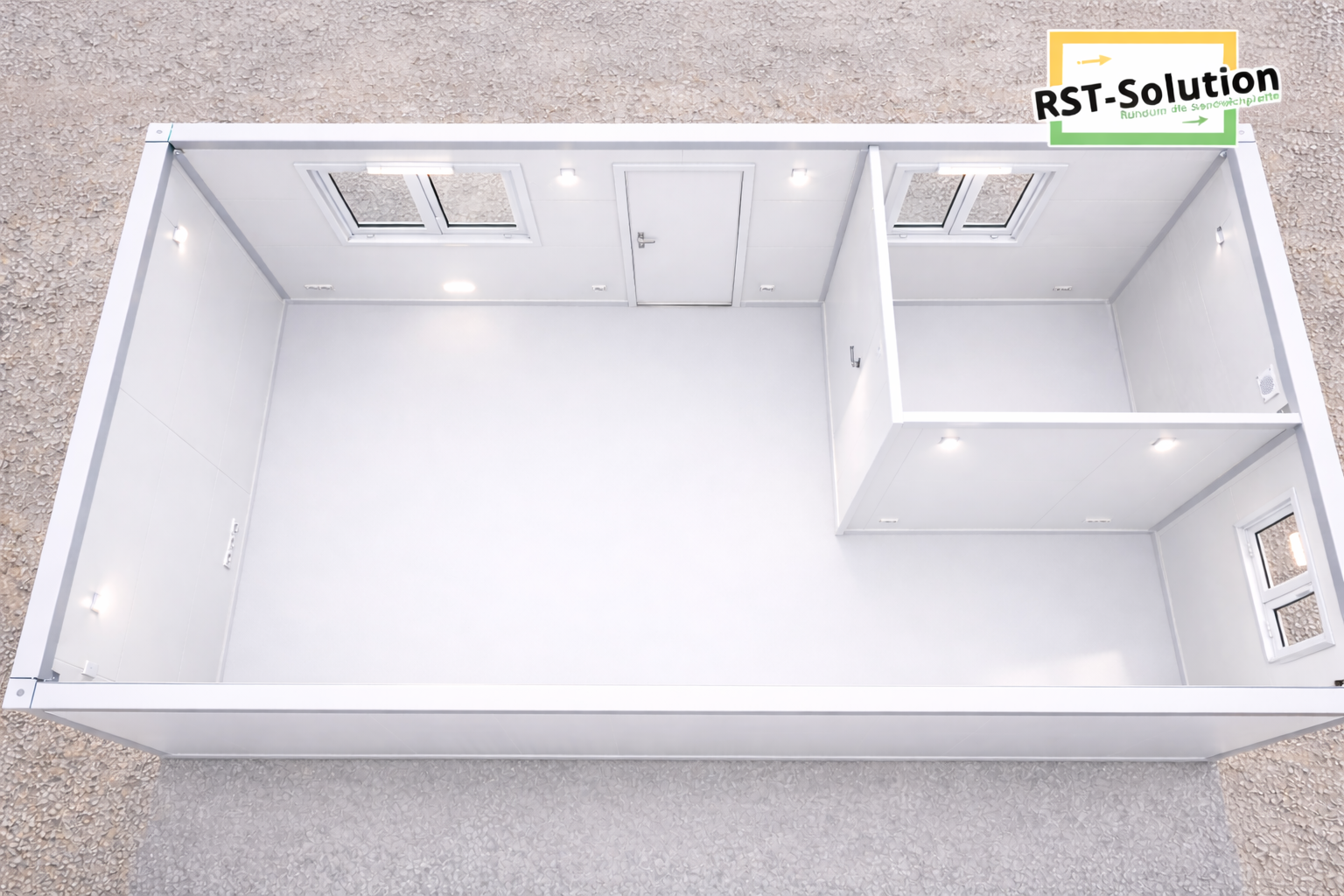 Der Container ist vollständig in Weiß gehalten – Wände, Decke und Boden sind einheitlich gestaltet, was einen sehr klaren, modernen und minimalistischen Eindruck vermittelt.