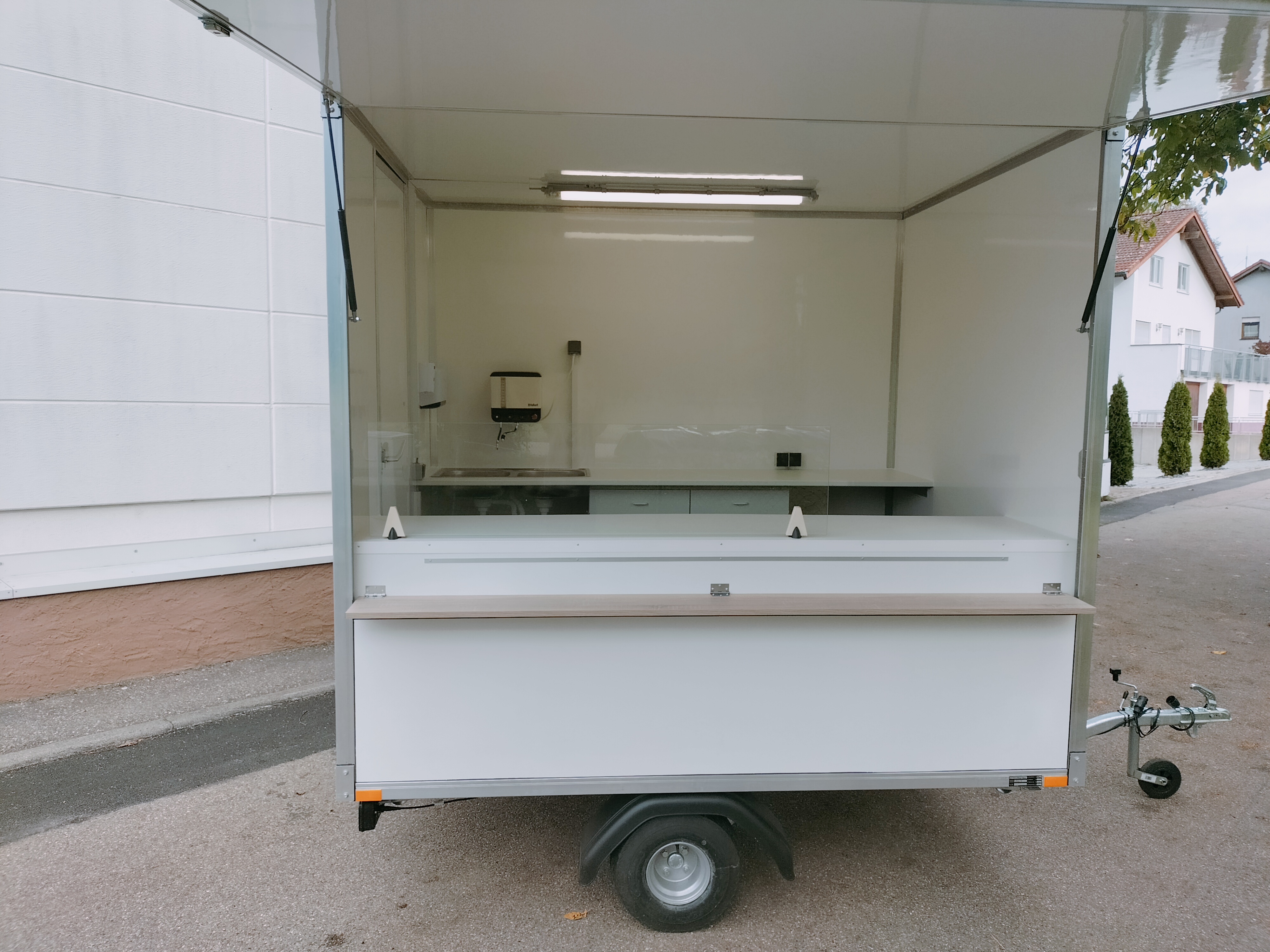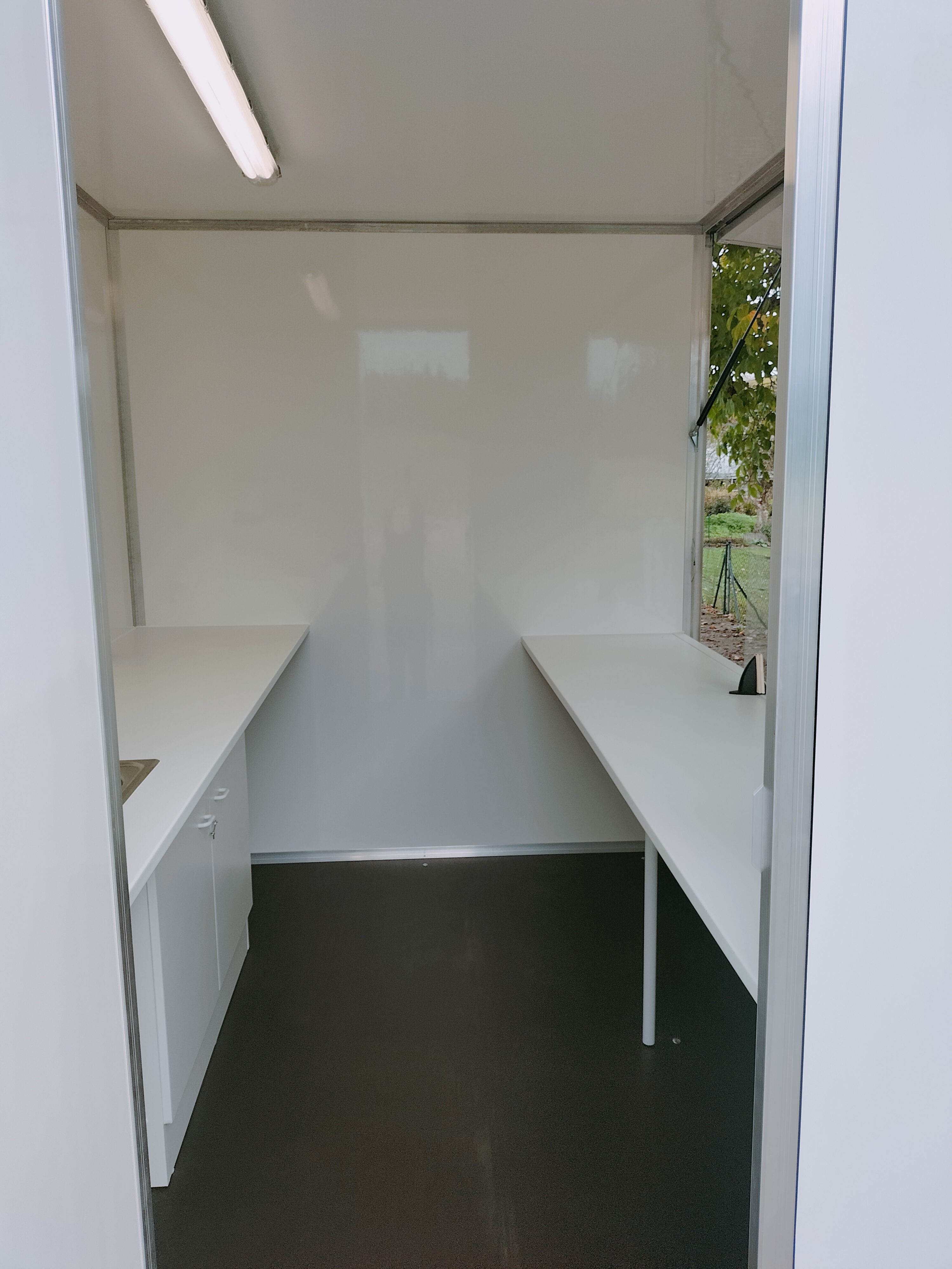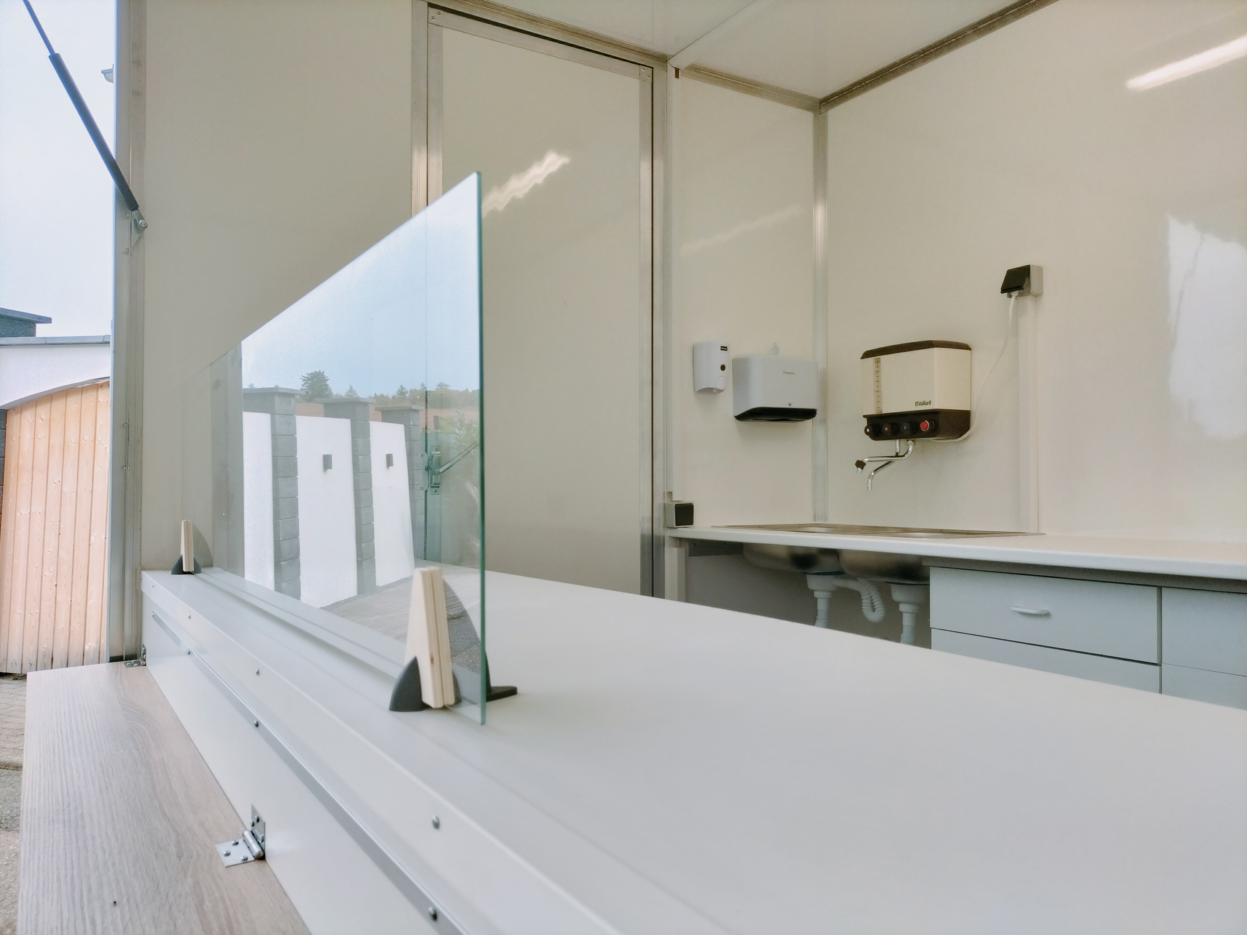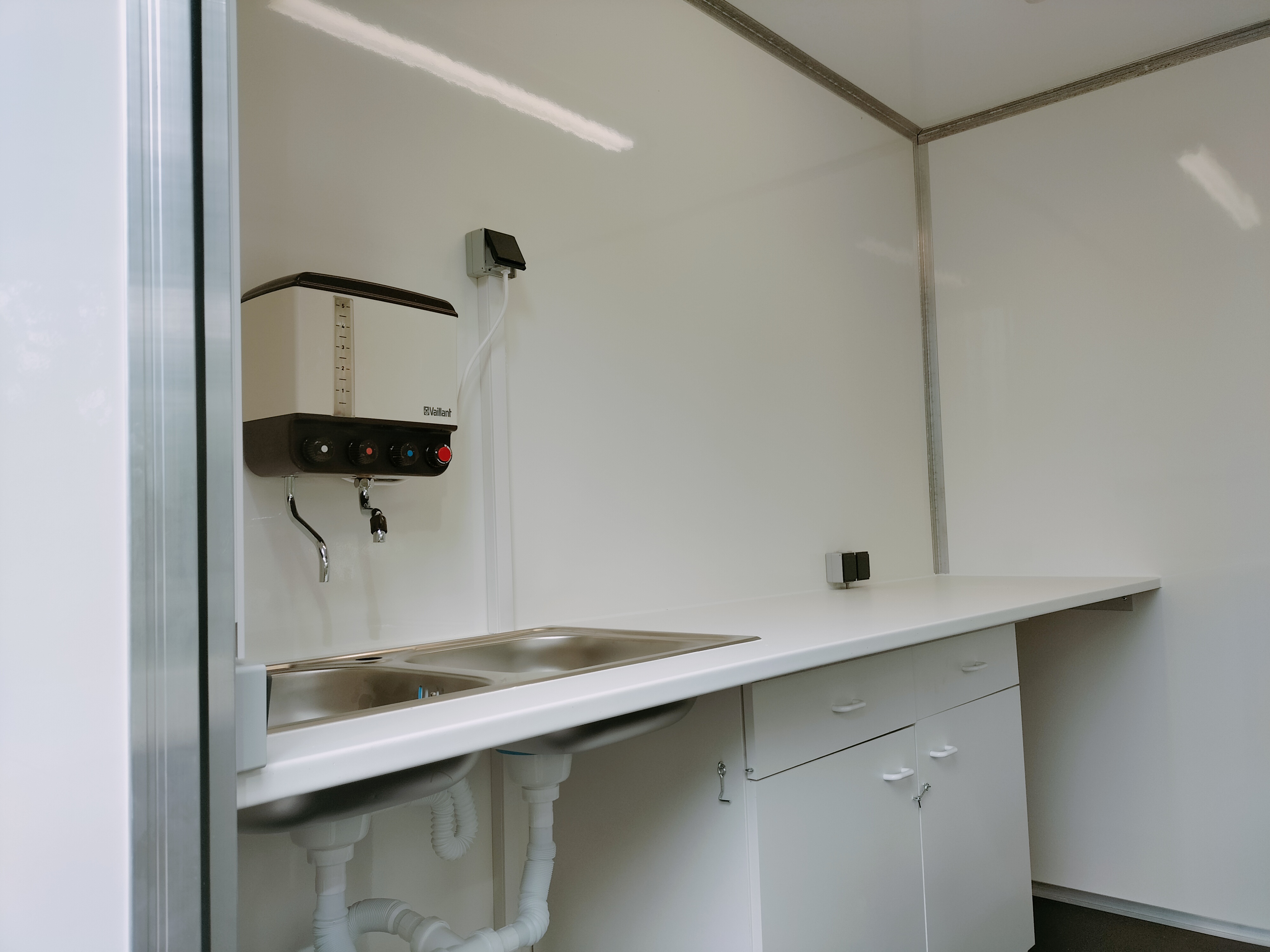 Wasserboiler, Doppelspülbecken, zwei Arbeitsplatten, Unterschrank, Spuckschutz, Thekenbrett, Deckenleuchte, Steckdosen, Stromanschluss,zwei Schlüssel, vier Kurbelstützen